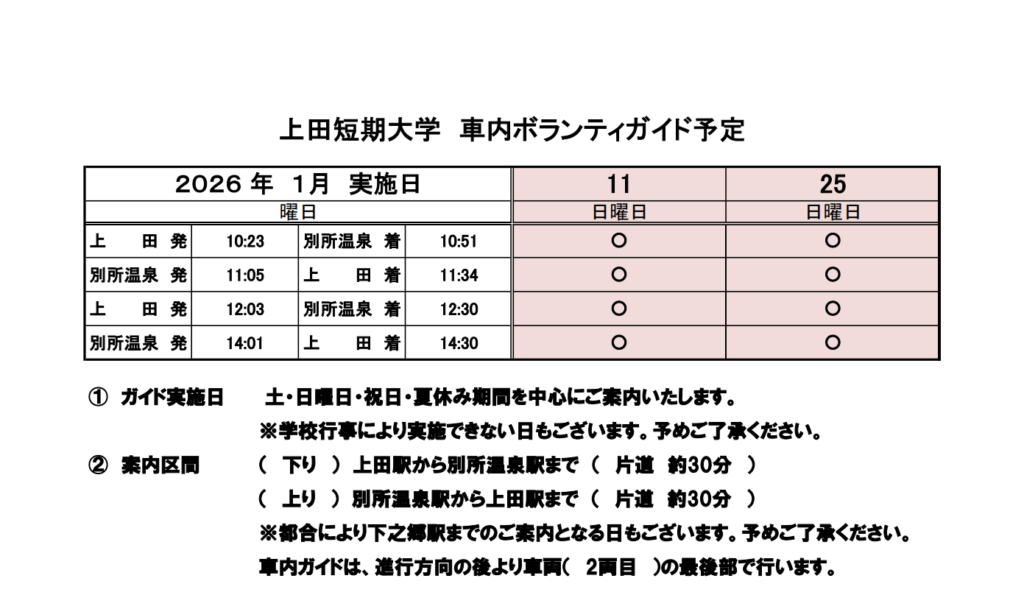 上田短期大学ボランティアガイドの皆さんが別所線沿線の観光スポットや別所温泉の魅力について、ご案内いたします。是非ご乗車ください。 ◎ガイド列車の運行については予定表をご覧ください。 ※都合により、ご案内区間が変更になる場合がございます。予めご了承ください。